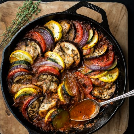 Una especialidad provenzal, un guiso de tomates, morrones, cebolla, berenjena y calabazas. Sazonadas con hierbas de la zona como el tomino, romero y ajo. Sano y vegetariano, se acompaña con arroz o para los carnívoros con pechuga de pollo.